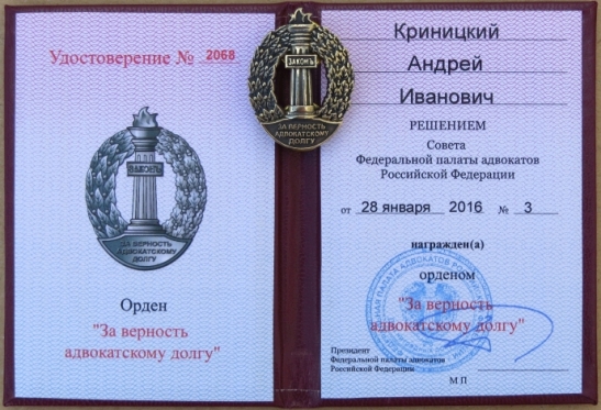 28 января 2016 г. награжден орденом "За верность адвокатскому долгу";